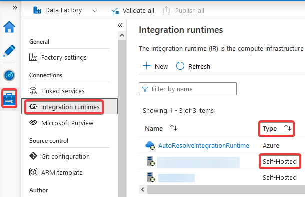 If the Connect via integration runtime property says something different, it will probably be a Self-Hosted Integration Runtime, but to be sure, double check that the Integration Runtime name you see in that property is of type Self-Hosted. You can do this by going to the Manage option and then Integration runtimes, it should say Self-Hosted in the Type column: