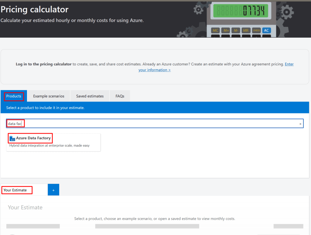 Now let’s get to the point. Click on the Pricing Calculator link, click on the tab Products, type “data factory” to look for the product within the products catalog and then click on the Azure Data Factory product link. It will load all the different operations and parameters that are used to estimate the cost of the everything you have within your Azure Data Factory instance.
