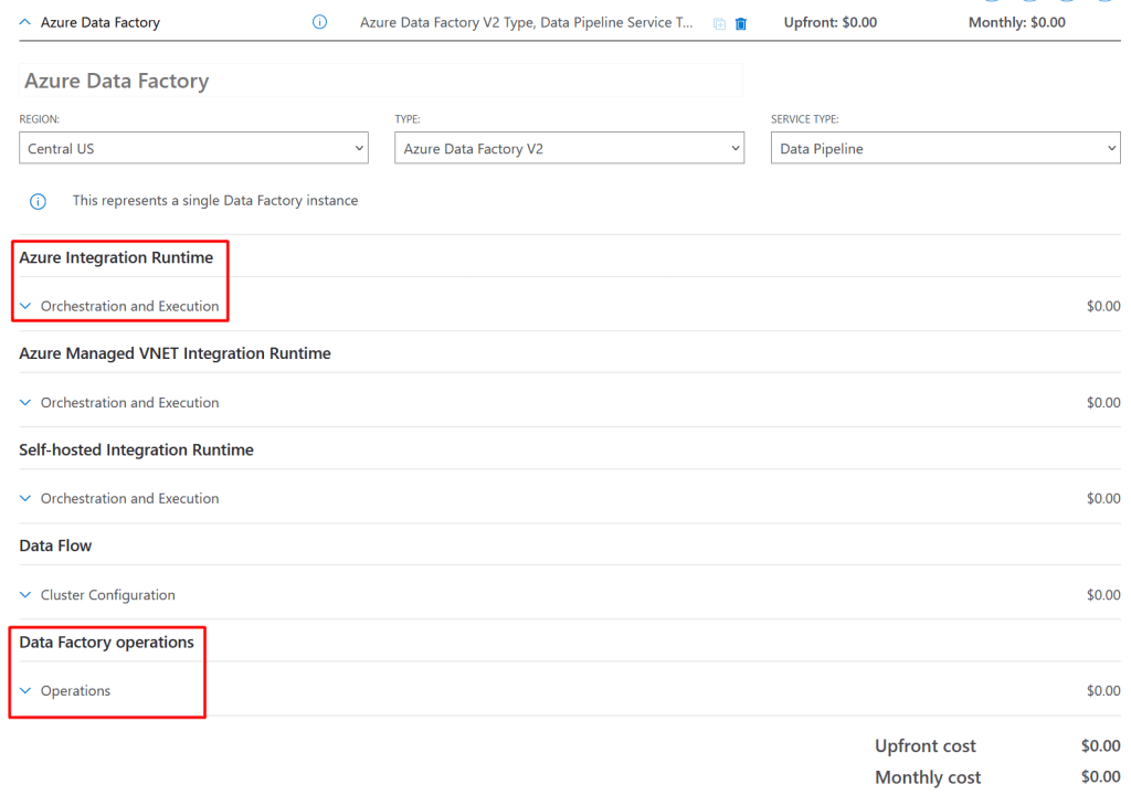 - Azure Managed VNET Integration Runtime: This is used to calculate the costs when you have an Azure Integration Runtime within a Data Factory managed virtual network. This is not my case