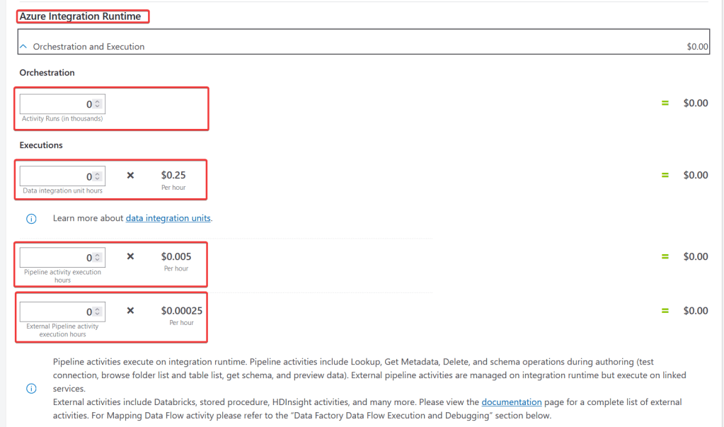 - External Pipeline activity execution hours (check the AZ Pricing Calculator image): External activities include Databricks, stored procedure, HDInsight activities, and many more. This the cheapest type of execution, which makes total sense, as AZ Data Factory would only be dispatching the execution of the activity