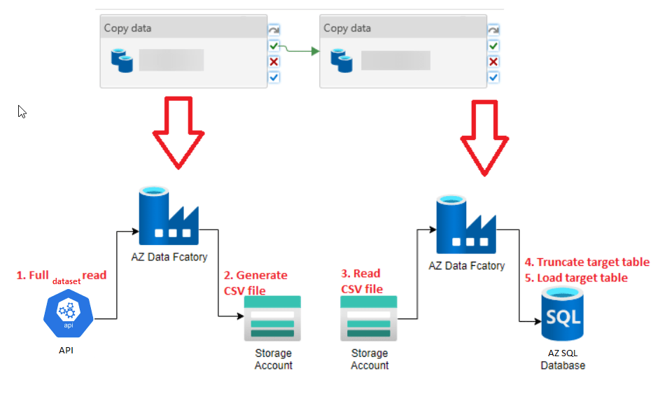 - Load data returned from the API call into a staging table and call a Stored Procedure to do a TRUNCATE-and-load operation: This would be cheaper than the original design because we would have one Copy Activity and one Stored Procedure Activity, which is an external activity; the database is the resource, which would be using its compute power to do the final step of loading the data into the final target table. Nevertheless, we would still be doing the TRUNCATE on the final target table, which means that the table would be empty/incomplete during the time the activity is loading the data into the table. A final user might be trying to access the final target table or accessing a report that queries this table and he/she would be seeing incorrect data or even no data at all