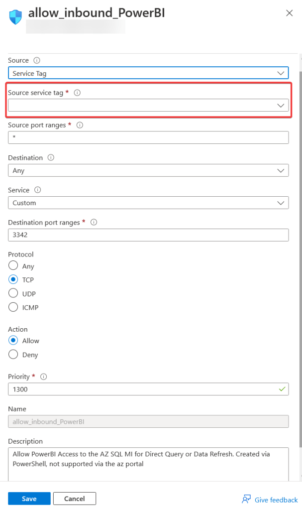 "description": "Allow PowerBI Access to the AZ SQL MI for Direct Query or Data Refresh. Created via PowerShell, not supported via the az portal",