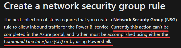 You will not find the service tag they mention in the documentation. You will be confused, and you will have to keep doing research in google. So, how can we add this rule to allow traffic from our Power BI Online account to our AZ SQL Managed Instance? The answer is in this link and you have to do this manually via PowerShell or the Command Line Interface (CLI). There is no way to do it via the azure portal as they mention it: