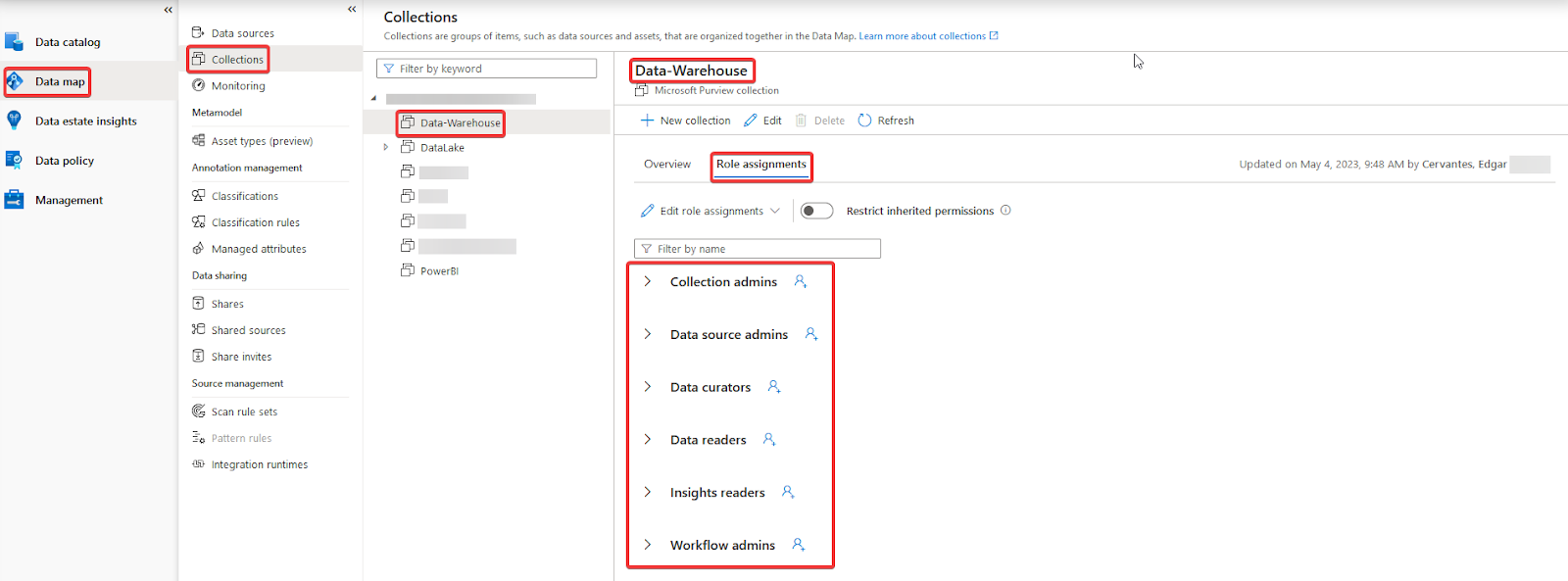 - Collections Admins: They can edit the collection, its details, add subcollections, and they add data curators, data readers, and other Microsoft Purview roles to a collection scope.