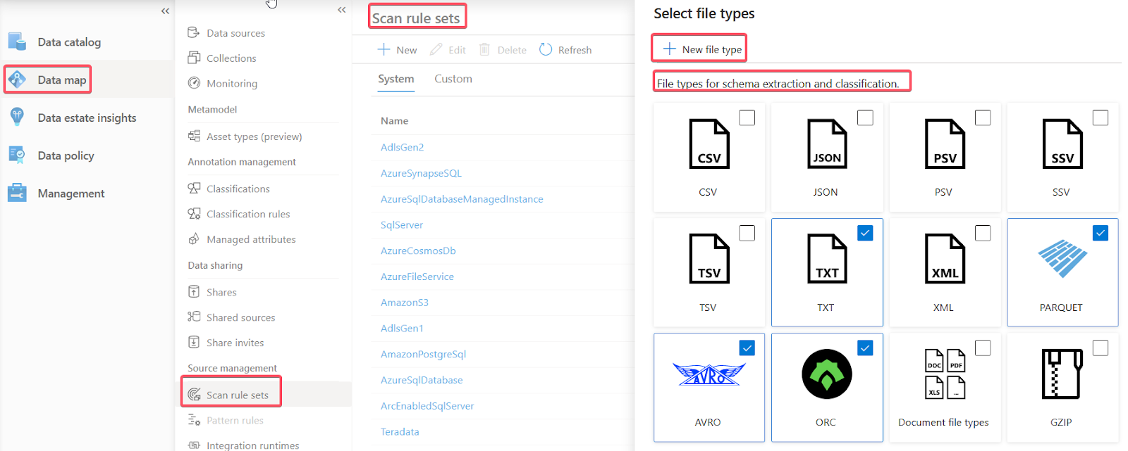 They are specific to the data-source type, and they are a way to group the rules you would like to apply during your Scans. You could use any of the built-in ones, or you can create your own ones. For instance, if we were to run a Scan on an Azure Storage Account, we could limit the scope of it by creating a custom Scan Rule Set and specifying the type of files we would like to Scan: